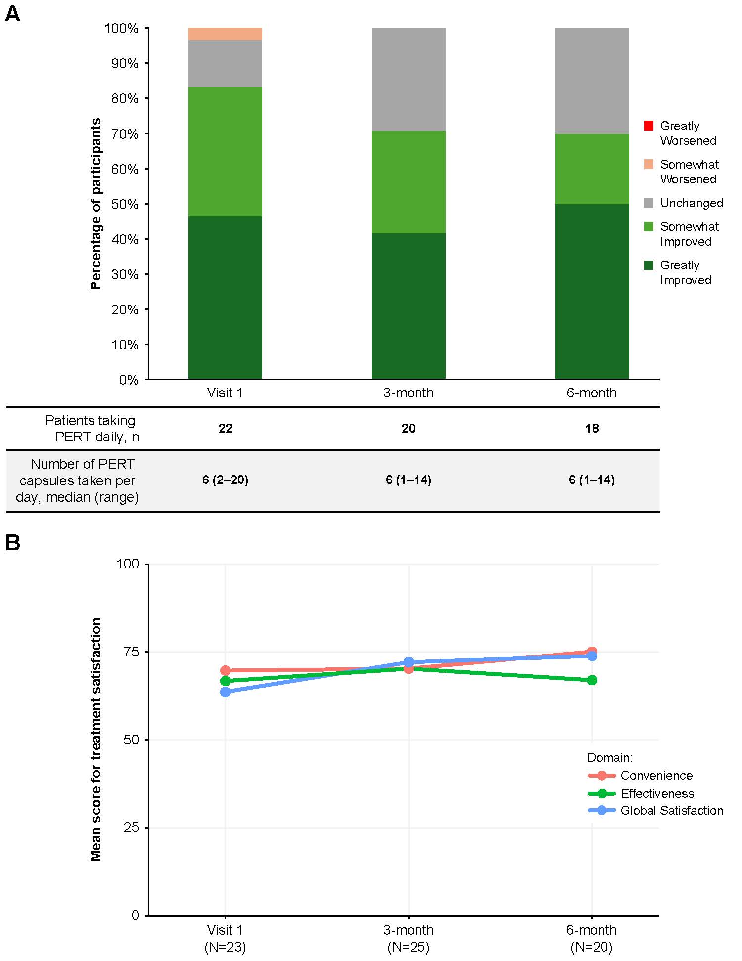 Figure: Figure 1A. Impact of PERT on symptoms over time up to 6 months as reported by patients taking PERT (pancrelipase; Zenpep® Delayed-Release Capsules). Figure 1B. Treatment satisfaction over time up to 6 months as reported by patients taking PERT (pancrelipase; Zenpep® Delayed-Release Capsules).