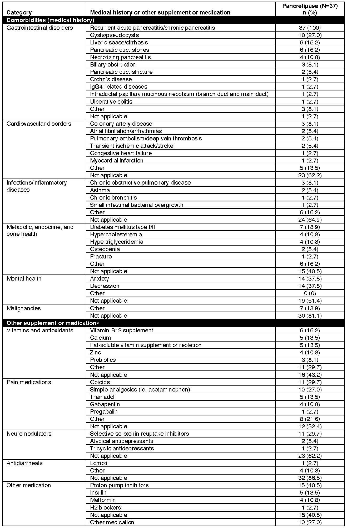 Jodie A. Barkin, MD, FACG1, Ismail Aouadi, MStat2, Jane Diamond, MS, FNP-BC3, Janine Twal, PharmD2, Jennifer Pack, MSN, ACNP-BC2, Trudi Delk, PharmD2, Cindy Frommor, BS4, Dianne Nguyen, MD2, David C. Whitcomb, MD, PhD5 1University of Miami Miller School of Medicine, Miami, FL; 2Nestlé Health Science, Bridgewater, NJ; 3Gastroenterology Department, Mayo Clinic, Jacksonville, FL; 4PPD Observational Studies, Thermo Fisher Scientific, Waltham, MA; 5Department of Medicine, Cell Biology & Physiology and Human Genetics, Division of Gastroenterology, Hepatology and Nutrition, University of Pittsburgh, UPMC and Ariel Precision Medicine, Pittsburgh, PA Introduction: PERT is the mainstay of EPI treatment. Frequently, patients (pts) receiving PERT may have multiple comorbidities requiring polypharmacy, which can contribute to pill burden, influence treatment satisfaction, impact PERT adherence, and negatively affect health-related quality of life (HRQoL). The aim of this study was to assess these factors or aspects in pts with EPI with chronic pancreatitis (CP) or recurrent acute pancreatitis (RAP). Methods: The US-based PAtient-CenTric Chronic Pancreatitis (PACT-CP) registry (NCT05762445) is a prospective, pt-driven registry designed to understand the unmet needs/burden of pts with EPI. Data were obtained from adults with suspected/confirmed EPI, a CP/RAP diagnosis, and taking PERT. Clinical characteristics, PERT use, treatment satisfaction (using the Treatment Satisfaction Questionnaire for Medication-9), and HRQoL (using physical [PCS-12] and mental [MCS-12] health scores) were collected from pts and/or their healthcare providers. Data from baseline to 6 months in pts receiving PERT (pancrelipase, Zenpep® Delayed-Release Capsules) are reported. Results: Of 188 pts in the registry, 37 took PERT at enrollment/Visit 1. Mean (SD) age was 59.5 (10.1) years, and 20 pts were female (59%, n=34). Anxiety (38%) and depression (38%) were commonly ( >30%) reported medical histories; diabetes mellitus was reported in 19% of pts (Table 1). At least 41% of pts were taking another type of medication. The most frequent clinical manifestations at 6 months were diarrhea (29%) and bloating (29%). Most pts took a median of 6 PERT capsules/day and reported PERT greatly or somewhat improved their symptoms at visits ≤6 months (Figure 1A). Pts were generally satisfied with treatment convenience and effectiveness; global satisfaction appeared slightly increased over time (Figure 1B). Mean (SD) PCS-12 scores appeared stable at the first (40.93 [10.06], n=29) and 6-month (40.60 [9.77], n=20) visits and showed a positive trend on the MCS-12 (42.28 [11.03] and 45.91 [11.37], respectively). Discussion: Most pts had comorbidities and a high pill burden, which could adversely affect treatment satisfaction and HRQoL. One limitation is that PERT use at baseline adherence/persistence could not be confirmed. Better understanding of how treatment satisfaction impacts treatment adherence/persistence and, subsequently, disease control or clinical outcomes may ultimately help improve HRQoL and reduce healthcare resource utilization in pts with EPI.