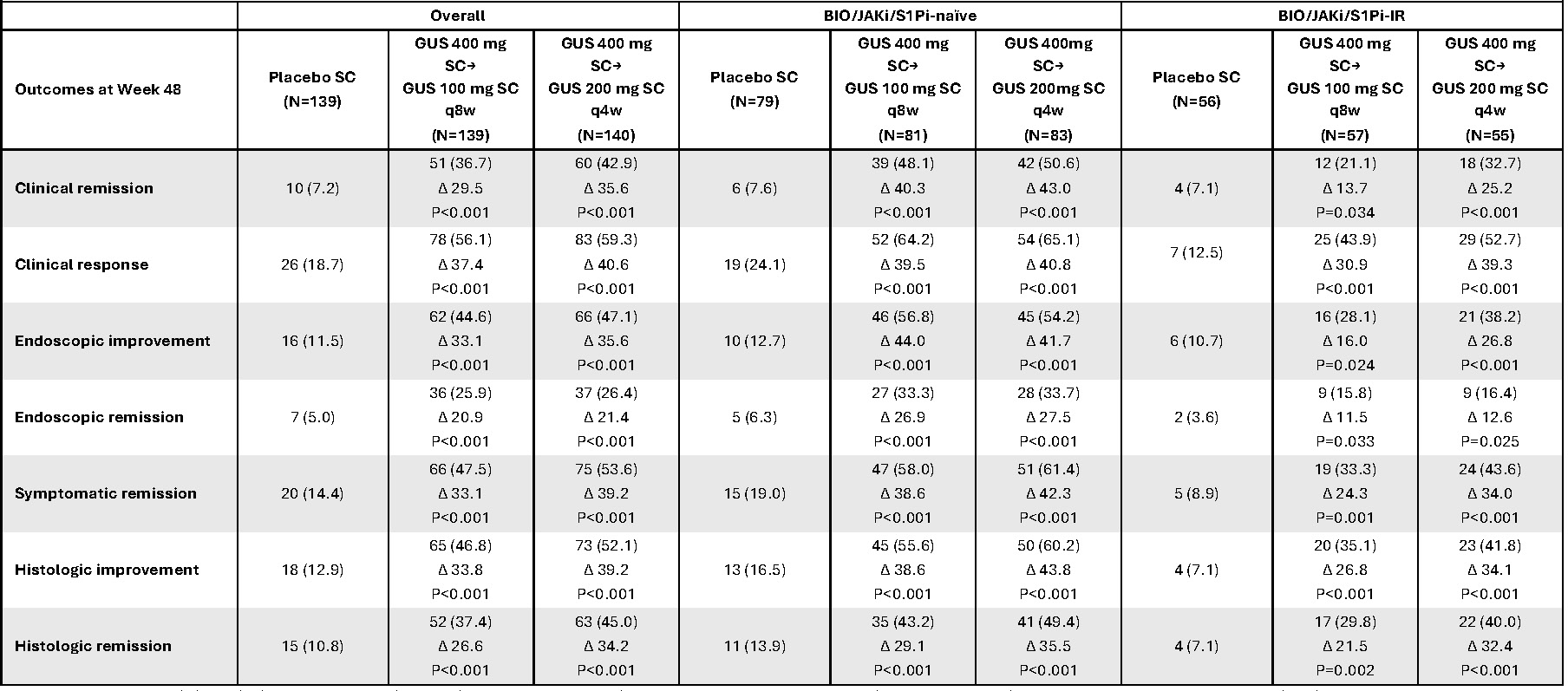 Caption: Data are presented as n (%); ∆% (adjusted treatment difference) versus placebo; nominal p-value versus placebo. The adjusted treatment difference was based on the common risk difference by use of the Mantel-Haenszel stratum weights and the Sato variance estimator. In the overall population, the p-values were based on the Mantel-Haenszel test, stratified by BIO/JAKi/S1Pi-IR status (Yes/No) and Mayo endoscopic subscore at baseline (Moderate [2]/Severe [3]). For the BIO/JAKi/S1Pi-naive/-IR subgroups, the p-values were stratified only by the Mayo endoscopic subscore at baseline. Participants who, prior to Week 48, had an ostomy or colectomy, a prohibited change in UC medications, discontinued study agent due to lack of efficacy or an AE of worsening of UC, or met rescue criteria per IWRS were considered not to have achieved any of the key efficacy endpoints shown at Week 48. For participants who discontinued study agent due to COVID-19-related reasons (excluding COVID-19 infection) or regional crisis, their observed values were used, if available. Participants who discontinued study agent prior to Week 48 due to other reasons were considered not to have achieved any of the efficacy endpoints shown at Week 48. Participants who were missing one or more of the components pertaining to an endpoint at Week 48 were considered not to have achieved the endpoint. Endpoint definitions: clinical remission, Mayo SFS 0/1 and not increased from BL, Mayo RBS=0, and MES 0/1 with no friability; clinical response, ≥30% and ≥2-point decrease from BL in Modified Mayo score with ≥1-point decrease from BL in RBS or RBS 0/1; endoscopic improvement, MES 0/1 with no friability; endoscopic remission, MES of 0; symptomatic remission, SFS 0/1 and not increased from BL and RBS=0; histologic improvement, neutrophil infiltration in <5% of crypts; no crypt destruction; and no erosions, ulcerations, or granulation tissue per Geboes grading system; histologic remission, absence of neutrophils from the mucosa (both lamina propria and epithelium); no crypt destruction; and no erosions, ulcerations, or granulation tissue per Geboes grading system. AE=adverse event; BIO=biologic; BL=baseline; COVID-19=coronavirus disease 2019; GUS=guselkumab; IR=inadequate response; IWRS=Interactive Web Response System; JAK=Janus kinase; JAKi=JAK inhibitor; MES=Mayo endoscopic subscore; N=population size; n=sample size; q4w=every 4 weeks; q8w=every 8 weeks; RBS=rectal bleeding subscore; S1P= sphingosine-1-phosphate; S1Pi=S1P inhibitor; SC=subcutaneous; SFS=stool frequency subscore; UC=ulcerative colitis