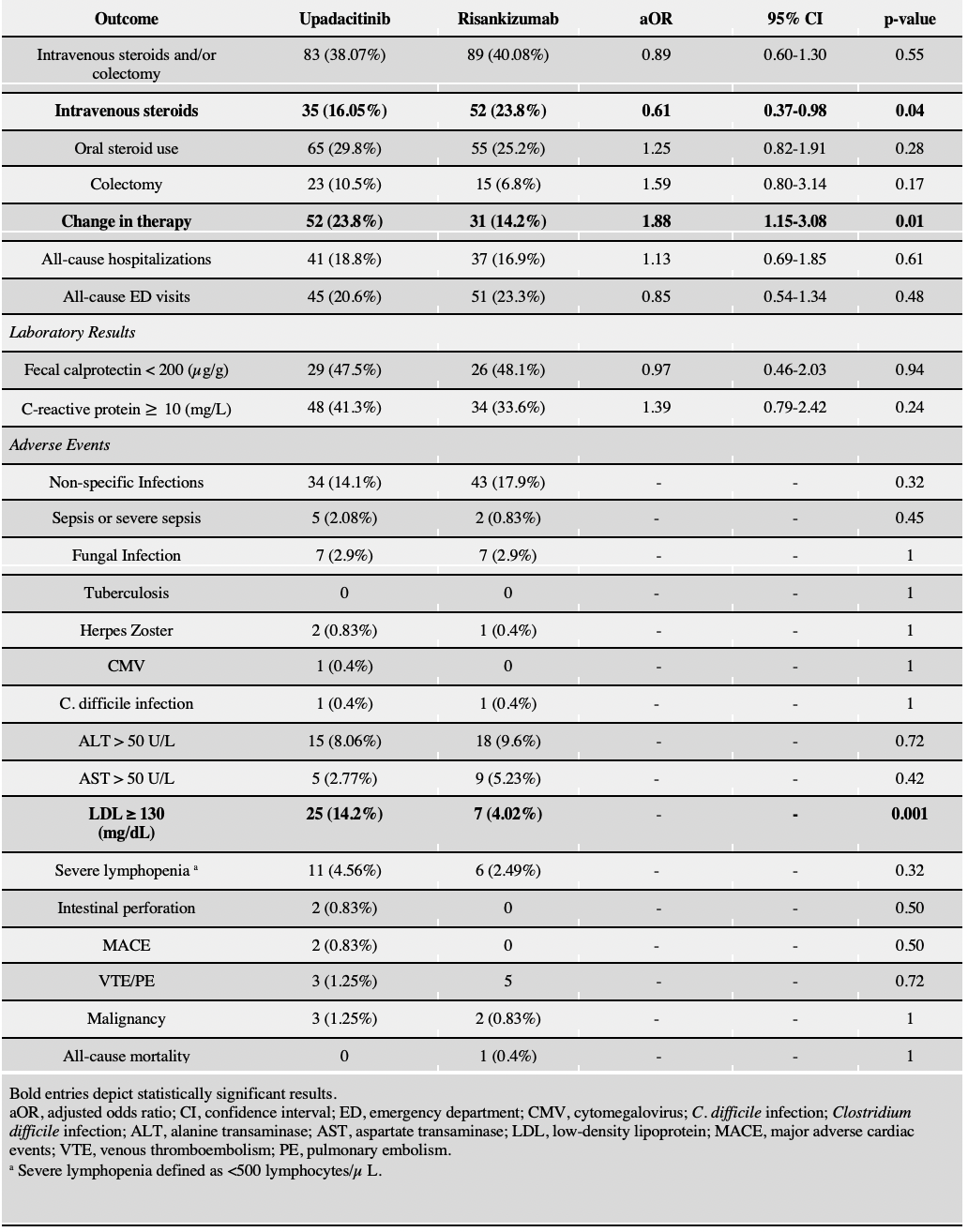 Figure: Table 1: Comparison of outcomes and adverse effects between the Upadacitinib cohort and Risankizumab cohort within 12 months of initiation after 1:1 propensity score matching.