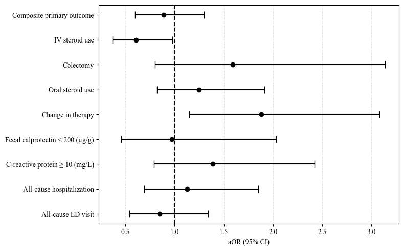 Figure: Figure 1: Forest Plot of aOR with 95% CI comparing clinical outcomes between the Upadacitinib and Risankizumab cohorts after propensity score matching. aOR, adjusted odds ratio; CI, confidence intervals; IV, intravenous; ED, emergency department.