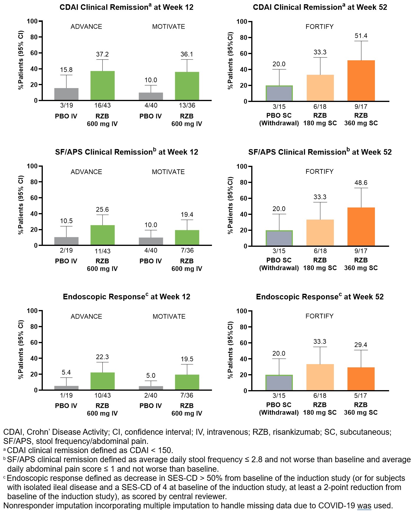 Jessica R. Allegretti, MD, MPH, FACG1, Javier Zambrano, MD2, Daniel O'Brien, PhD2, Jameson Crowley, PhD3, Fernando Aponte, MD2, Yafei Zhang, PhD2, Jeanie K.. Meckes, PhD2, Christian Maaser, MD4 1Division of Gastroenterology, Hepatology, and Endoscopy, Brigham and Women’s Hospital, Harvard Medical School, Boston, MA; 2AbbVie Inc., North Chicago, IL; 3AbbVie inc., North Chicago, IL; 43Ambulanzzentrum Gastroenterologie, Klinikum Lüneburg, Lüneburg, Hamburg, Germany Introduction: Risankizumab (RZB), an interleukin (IL)-23 p19 inhibitor, has demonstrated efficacy in patients with moderate-to-severe Crohn’s disease (CD), including refractory patients who previously failed ≥2 biologics.1-3 This post-hoc analysis reports the efficacy of RZB in patients with refractory CD previously exposed to ustekinumab (UST) from the phase 3 ADVANCE (NCT03105128) and MOTIVATE (NCT03104413) trials. Methods: This analysis included patients with moderate-to-severe CD and intolerance/inadequate response to ≥1 biologic (both studies) and/or conventional therapy (ADVANCE) who received 12 weeks of intravenous (IV) RZB 600 mg induction or placebo (PBO); clinical responders to 12 weeks of RZB induction were rerandomized in the FORTIFY (NCT03105102) maintenance trial to receive 52 weeks of subcutaneous (SC) RZB (180 mg or 360 mg) or PBO (withdrawal). Clinical remission (per CD Activity Index [CDAI] and stool frequency/abdominal pain [SP/APS]) and endoscopic response were evaluated in a subgroup of patients with prior UST exposure. Results: A total of 62 patients (ADVANCE) and 76 patients (MOTIVATE) with prior UST exposure were included in this analysis; most of whom had previously failed ≥3 biologics. Over 90% of them had previously failed anti-TNF and/or vedolizumab. At induction week 12, more patients treated with IV RZB 600 mg vs PBO achieved clinical remission per CDAI (ADVANCE: 37.2% vs 15.8%; MOTVIATE: 36.1% vs 10.0%) and SF/APS (ADVANCE: 25.6% vs 10.5%; MOTVIATE: 19.4% vs 10.0%) and endoscopic response (ADVANCE: 22.3% vs 5.4%; MOTIVATE: 19.5% vs 5.0%). At maintenance week 52, more patients treated with SC RZB 180 mg or 360 mg vs PBO (withdrawal) achieved clinical remission per CDAI (33.3% or 51.4% vs 20.0%) and SF/APS (33.3% or 48.6% vs 20.0%) and endoscopic response (33.3% or 29.4% vs 20.0%). Discussion: Although RZB and UST have similar mechanisms of action (IL-23 inhibition), patients with refractory CD previously exposed to UST showed clinical and endoscopic improvements with RZB treatment. These findings were consistent with RZB’s efficacy rates observed in patients who failed ≥2 biologics as well as real-world evidence of RZB’s efficacy in patients with prior UST failure in CD.3-5