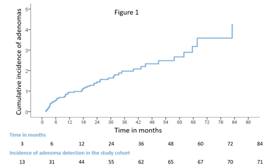 Figure: Figure 1: Among the IMDC cohort, 71 patients developed adenoma polyps on follow-up colonoscopies. Notably, over 50% of these adenomas developed rapidly within 7.5 months of IMDC onset, after which the rate of adenoma development declined over the subsequent six years.