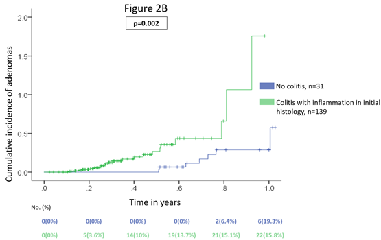 Figure: Figure 2b: Among patients with IMDC, those that had histological inflammation and no polyps on baseline colonoscopy had a significantly higher cumulative incidence of adenoma development compared to the historical control group who received ICI therapy but did not develop IMDC.
