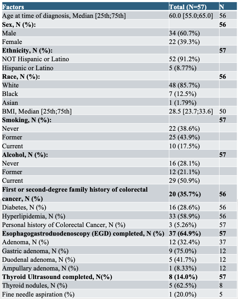 Islam Mohamed, MD1, Ahmed N.. Mohamed, MD1, Moath Albliwi, MD1, Qijun Yang, MS2, Chabaklo Khodor, MD3, Yara Shatnawi, MD1, Muaz Alsabbagh Alchirazi, MD4, Carol A.. Burke, MD, MACG2, Carole Macaron, MD2 1Cleveland Clinic Foundation, Cleveland, OH; 2Cleveland Clinic, Cleveland, OH; 3Cleveland Clinic Florida, Cleveland, OH; 4Detroit Medical Center/Wayne State University, Cleveland, OH Introduction: Colonic oligopolyposis of unknown etiology (CPUE) is defined as the presence of 10–99 cumulative colorectal adenomas in the absence of identifiable pathogenic variants in known polyposis-associated genes. Existing literature on this population is primarily derived from case series using registry databases, which are prone to ascertainment bias. This study aims to characterize the clinical features of patients with adenomatous oligopolyposis using data from a pathology database to better capture a more representative cohort. Methods: Under IRB approval, we conducted a retrospective chart review using natural language processing to identify patients with 10–99 cumulative colorectal adenomas diagnosed between March 2009 and December 2023 through the Cleveland Clinic’s pathology database. Patients with a known personal or family history of hereditary colorectal cancer syndromes were excluded. Clinical, demographic, and procedural data were collected. Descriptive statistics were used. Results: Among 385 patients with 10-99 cummulative colorectal adenoma, 118 (30.6%) referred for genetic counseling, and 57 (48%) were diagnosed with colonic oligopolyposis of unknown etiology following negative genetic testing. The median age at diagnosis was 60 years (IQR: 55–65). Of these patients, 34 (60.7%) were male and 48 (85.7%) were White. A majority reported current or former tobacco use (61.4%) and alcohol use (72.0%). A first- or second-degree family history of colorectal cancer was documented in 20 patients (35.7%). Among the 37 patients who underwent upper endoscopy, 12 (32.4%) had upper gastrointestinal adenomas: 9 (75%) gastric, 5 (42%) duodenal, and 1 (8.3%) ampullary. Thyroid nodules were identified in 5 of the 8 patients (62.5%) who underwent thyroid ultrasound. Fine-needle aspiration was performed in one patient, with no thyroid cancer detected (Table).. Discussion: In our cohort of patients with colonic oligopolyposis of unknown etiology, identified through a single-center pathology database, patients were older males and current or former users of tobacco and alcohol. One-third had a family history of colorectal cancer. Upper gastrointestinal adenomas were present in approximately one-third of patients, consistent with prior studies, underscoring the risk of upper GI neoplasia in this population and supporting the need for upper gastrointestinal surveillance.
