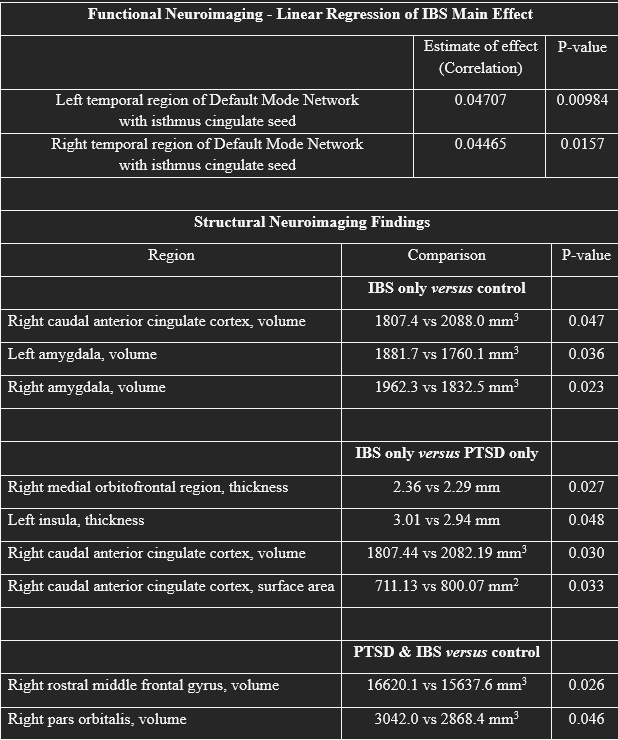 Figure: Table 2: Significant Functional and Structural MRI Neuroimaging Findings: Regarding the functional MRI cohort (“Functional Neuroimaging “, top), of 587 TRACTS participants, 50 were screened in for IBS through review of the electronic health record based on Rome IV criteria. Results summarized under “Structural Neuroimaging Findings” (bottom) are based on an earlier analysis of the TRACTS cohort with a smaller sample size (N=499) with 43 IBS participants. No significant differences were noted between the demographic patterns (data not shown).