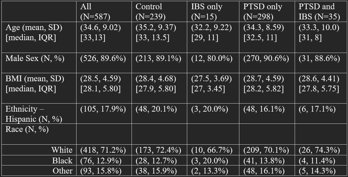 Figure: Table 1: Demographic data of Study Participants in TRACTS: In a total of 587 participants in TRACTS, 50 were screened in for IBS based on the presence of clinical Rome IV criteria (recurrent abdominal pain associated with a change in bowel habits) and/or ICD10 coding during electronic health record review. Race was self-reported, and the ‘Other’ race category includes individuals who are multi-racial as well as those with not reported race. The majority of participants were White and male. Demographic characteristics were similar between groups except a slightly younger age of participants with IBS. TRACTS, Translational Research Center for Traumatic Brain Injury and Stress Disorders; BMI, Body Mass Index; IBS, Irritable bowel syndrome; PTSD, post-traumatic stress disorder.