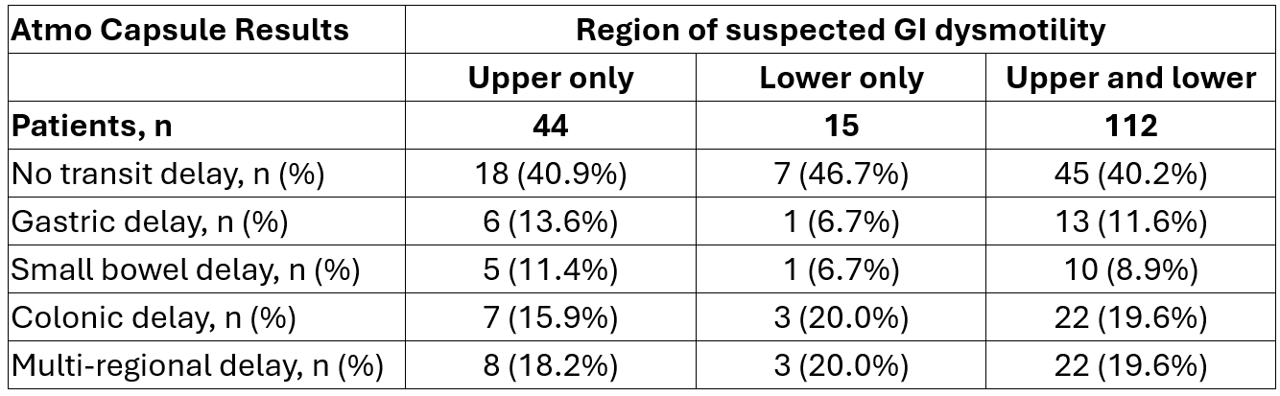 Baha Moshiree, MD1, Thomas Abell, MD2, Ashok Attaluri, MD3, William Chey, MD, FACG4, Michael Cline, DO5, William L.. Hasler, MD6, Vincent Ho, MD7, Braden Kuo, MD8, Allen Lee, MD, MS9, Amir Masoud, MD10, Richard McCallum, MD, FACG11, Eamonn M.. Quigley, MD, MACG12, Irene Sarosiek, MD11, Satish SC. Rao, MD, PhD, FACG13, Mayra Sanchez, MD14, Abigail Stocker, MD2, Brian Surjanhata, MD15, Jerry Zhou, PhD7, Anthony Lembo, MD, FACG16 1Atrium Health Carolinas Medical Center, Charlotte, NC; 2University of Louisville, Louisville, KY; 3University of Kansas Health System, Olathe, KS; 4University of Michigan Health, Ann Arbor, MI; 5Cleveland Clinic, Cleveland, OH; 6Mayo Clinic Arizona, Scottsdale, AZ; 7Western Sydney University, Campbelltown, New South Wales, Australia; 8Center for Neurointestinal Health, Massachusetts General Hospital, Boston, MA; 9University of Michigan Medical School, Ann Arbor, MI; 10Hartford Healthcare/Connecticut GI, Madison, CT; 11Texas Tech University Health Sciences Center, El Paso, TX; 12Houston Methodist Hospital, Houston, TX; 13Augusta University Medical Center, Augusta, GA; 14Hartford HealthCare's Neurogastroenterology and Motility Center, Fairfield, CT; 15Massachusetts General Hospital, Harvard Medical School, Boston, MA; 16Cleveland Clinic Foundation, Cleveland, OH Introduction: Gastrointestinal (GI) dysmotility often results in abnormal transit times in multiple regions of the gut. The location and distribution of dysmotility is important for appropriate clinical management, however, symptoms alone do not accurately predict delays or their location. The Atmo Capsule is a novel diagnostic tool that can be used to objectively measure regional gut transit times in a single test. We evaluated the relationship between patients’ presenting symptoms and objectively measured GI transit time data from the Atmo Capsule across different regions of the GI tract. Methods: 209 patients with suspected GI dysmotility underwent evaluation with the Atmo Capsule. This analysis utilized data from 171 patients without protocol deviations who had valid transit measurements for all regions of the gut. Patients were categorized based on symptoms as having suspected upper GI (e.g., postprandial fullness, nausea; n=44), lower GI (e.g., chronic constipation per ROME IV criteria; n=15), or pan-GI dysmotility (n=112). Regional transit times were considered delayed as follows: gastric emptying ≥ 5 h; small bowel transit, ≥ 6 h; colonic transit, ≥ 59 h. Results: Delayed transit times were identified in 59% of patients (101/171). Of those, 33% had transit delays affecting multiple GI regions (Table 1). Patients with symptoms leading to suspicion for isolated upper or lower GI dysmotility often had transit delays beyond the suspect region. Specifically, only 14% (6/44) of patients with suspected upper GI dysmotility had isolated delayed gastric emptying; similarly, only 20% (3/15) of those with suspected lower GI dysmotility had isolated delayed colonic transit. Among patients with suspected pan-GI dysmotility, only 20% (22/112) had multi-regional transit delays. Discussion: Presenting symptoms poorly predicted the presence and distribution of transit time abnormalities. Objective testing with the Atmo Capsule revealed that transit time delays rarely corresponded to the region of suspected dysmotility and often affected multiple regions of the gut. These findings indicate that symptoms are poorly predictive of location of transit delay thus supporting the value of objective assessments of whole-gut transit and raise the possibility that other factors may be involved in symptom generation.