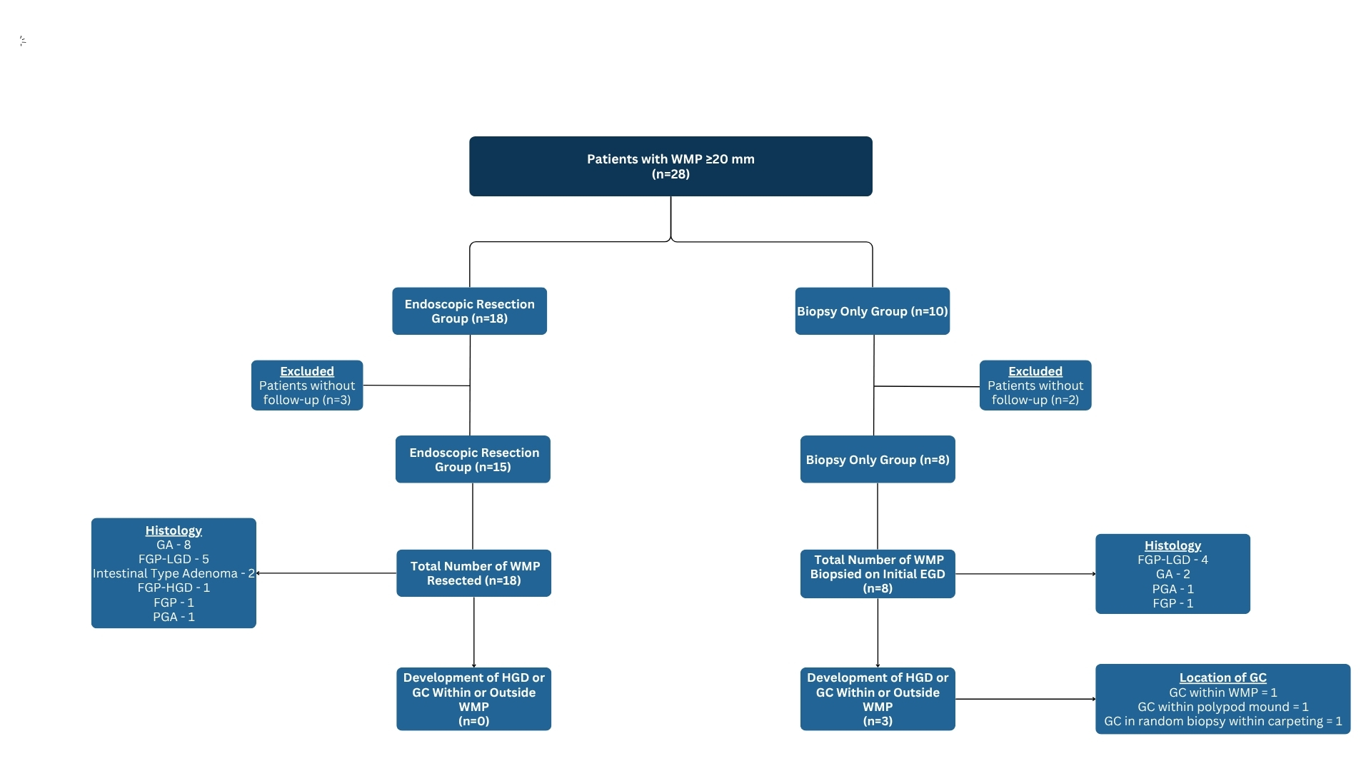Of 10 patients without resection, 2 were excluded for no follow-up. In the 8 remaining patients, 3 developed GA with HGD or GC. Mean surveillance time was 59.1 mos (6.9-106.3 mos), with an average of 6.5 (2-14) follow-up EGDs/patient. Initial WMP histology was FGP-LGD (n=4), GA (n=2), PGA-LGD (n=1), and FGP (n=1). Discussion: Over 1/3 of patients with unresected WMPs develop advanced gastric pathology within 5 years of detection, both within and outside the WMP. ESD and hybrid ESD/EMR are the optimal resection techniques for WMPs showing no recurrence or progression to advanced gastric pathology over 4 years. Understanding patient selection for resection, ensuring meticulous endoscopic surveillance, and using expert in endoscopic detection and resection of high-risk lesions are critical.
