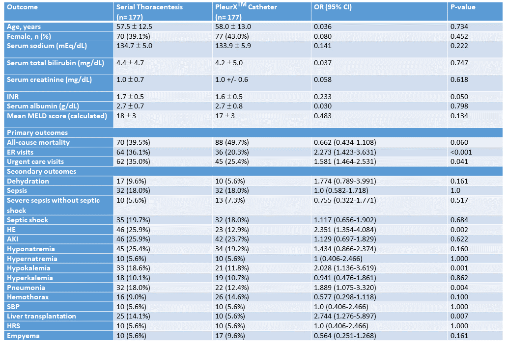 Figure: Table 1: Baseline clinical characteristics, primary and secondary outcomes among serial thoracentesis vs. pleurX catheter in hepatic hydrothorax at 18 months post-intervention.